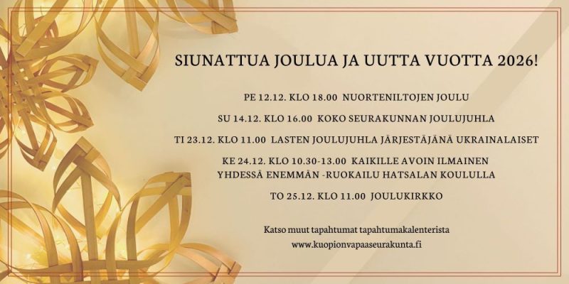 Perheiden ulkoilutapahtuma pääsiäisenä ma 6.4.2026 klo 15-17 Ylä-Antikkalan laavulla Puijolla, Antikkalantie 71. Makkaranpaistoa, nokipannukahvit, suolaista ja makeaa syötävää. Yhteistä tekemistä, mäenlaskua jos keli sallii, nuotiolauluja, opetusta ja yhdessäoloa. Tervetuloa mukaan!