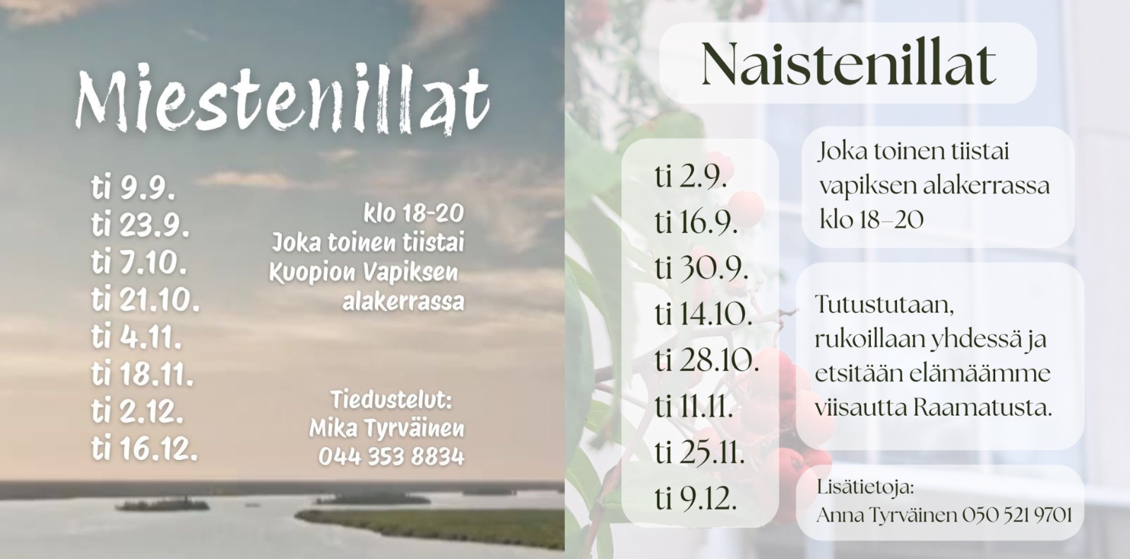 26.8. alkoivat miestenillat ja 2.9. alkavat naistenillat, jotka jatkuvat vuoroviikoin. Tule keskustelemaan, rukoilemaan ja tutkimaan sanaa yhdessä. Molemmat kokoontuvat alakerrassa. Tervetuloa! Miestenillat Naistenillat